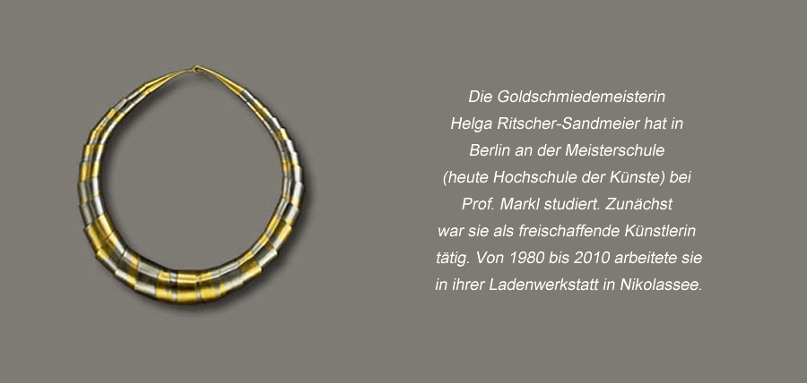 Bevor ich anfing, als Goldschmiedemeisterin zu arbeiten, habe ich in Berlin an der Meisterschule (heute Hochschule der Künste) bei Prof. Markl studiert. Zunächst war ich als freischaffende Künstlerin tätig. Von 1980 bis 2010 arbeitete ich dann in meiner Ladenwerkstatt in Nikolassee.